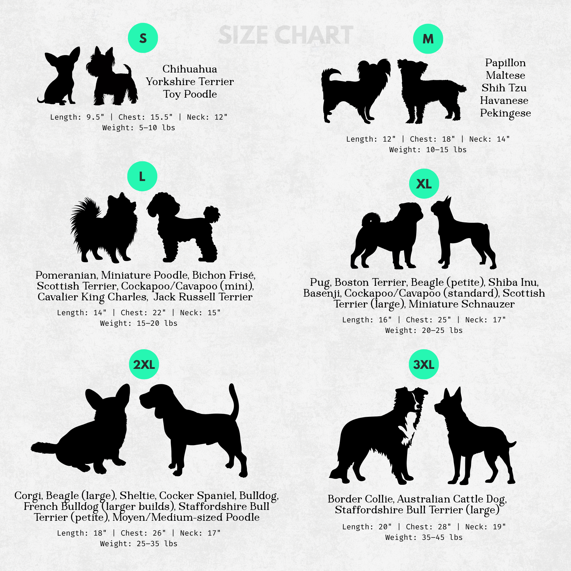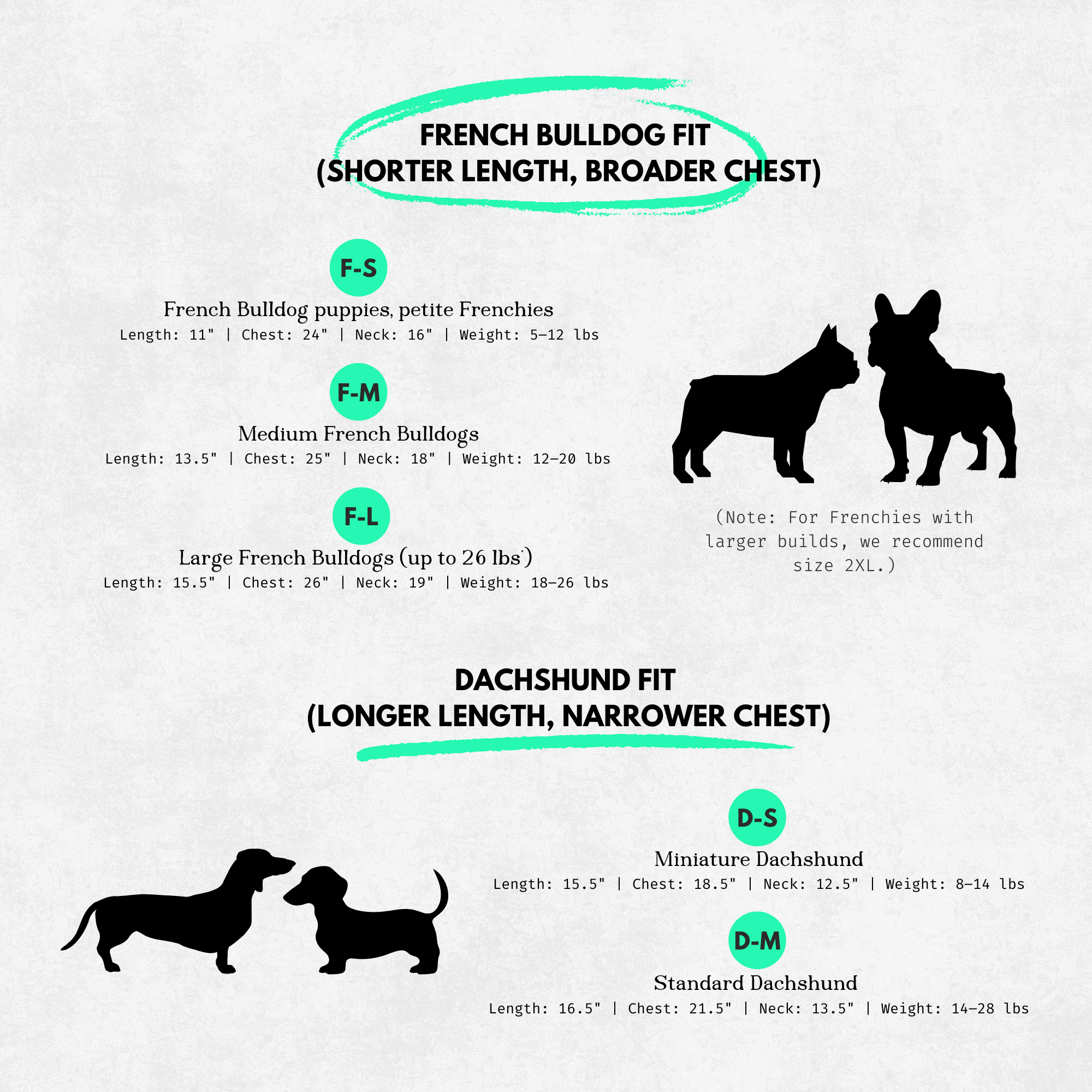✔️ Sizes up to 13XL (yes, even sizing for Frenchies and dachshunds. We see you!)